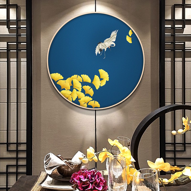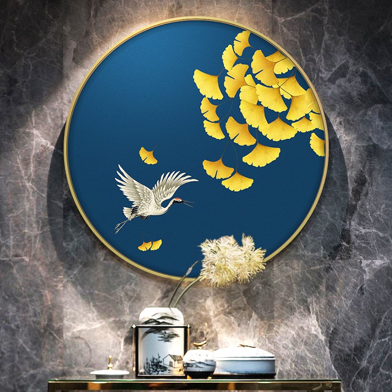 新中式玄关手绘油画走廊壁画挂画花鸟圆形装饰画 仙鹤送福