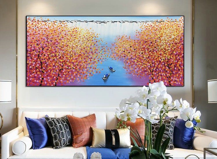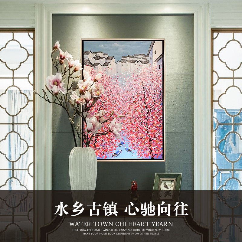 纯手绘油画 现代新中式客厅玄关装饰画风景画挂画壁画 红色水乡