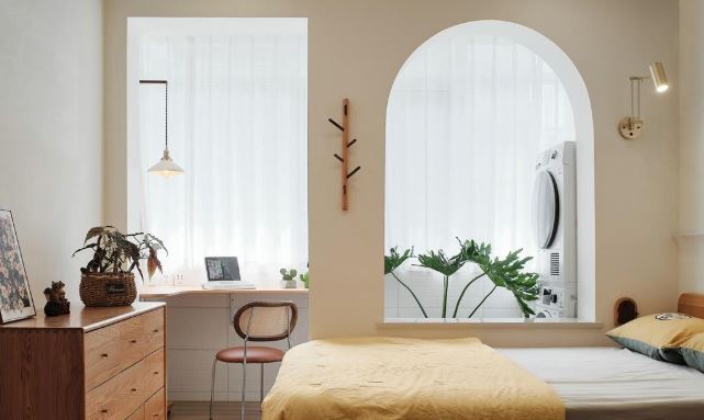 把主卧室一分为二,得到两个功能区:一个休息空间加一个多功能房。多功能房就解决原本没有客厅的缺憾,但放弃了茶几,用一张长桌可以充当桌面,立即升级成书房功能,而且这样搭配,特别上网课的儿童,长桌高度还可以调节,很符合人体工程学。
