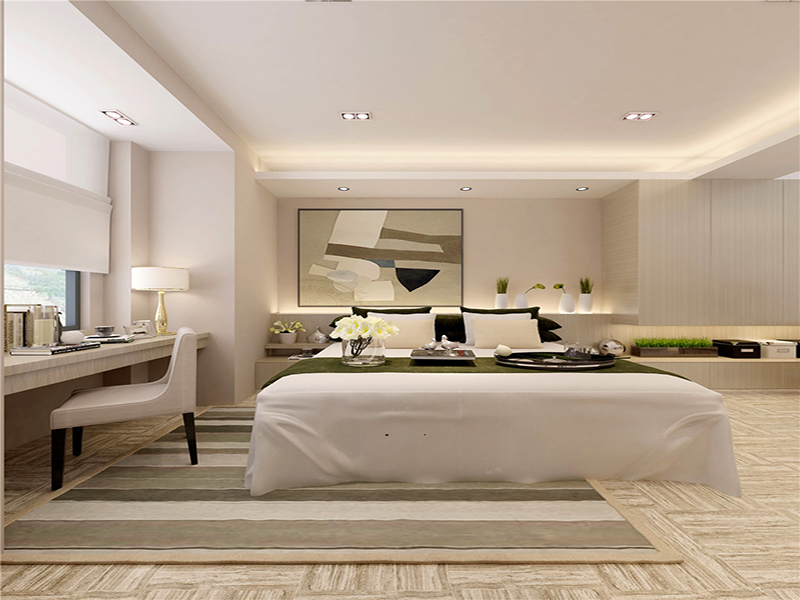 主卧以自然清爽的简欧风格作为主旋律,白色、木色为基调,背景墙做置物及台面融合床柜作用,起到节约空间的作用,台面放置装饰油画,不但好用还提升气氛感。