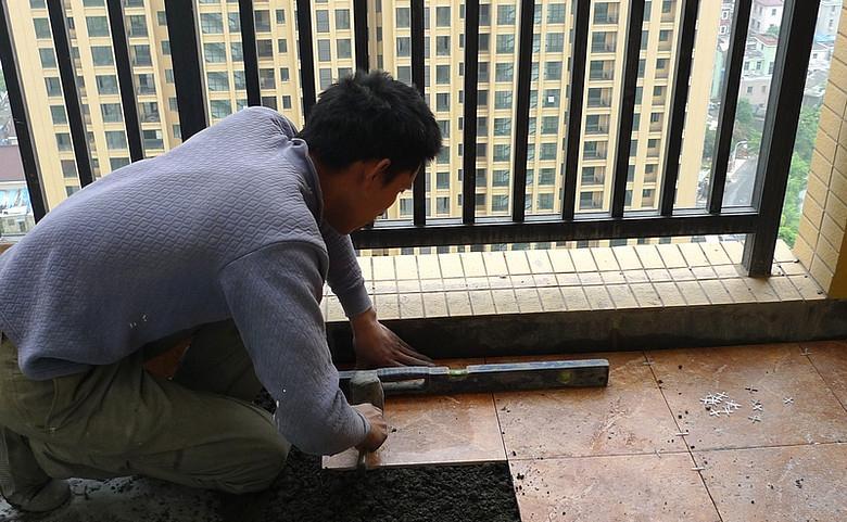 泥工的活在继续咯——卫生间上填缝剂及阳台地砖铺贴。卫生间在上填缝剂。我曾经以为填缝剂,是一条缝一条缝那样勾出来的,不是这样大面的刷,再清洗的。